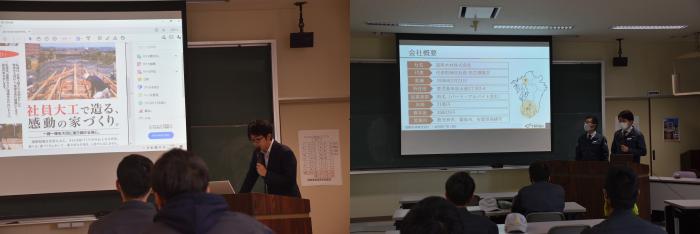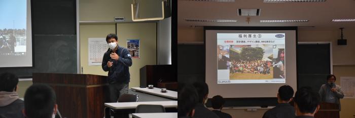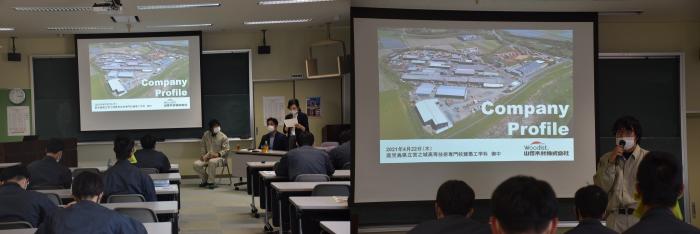 就職活動の一環として、就活生を対象とした会社説明会を開催しました。4月は県内企業9社の社長や人事担当者に日替わりで来校していただき、事業内容や採用に向けたお話をしていただきました。