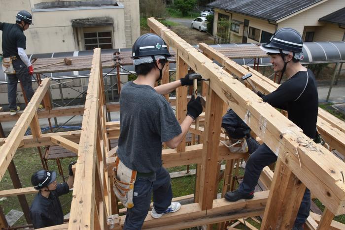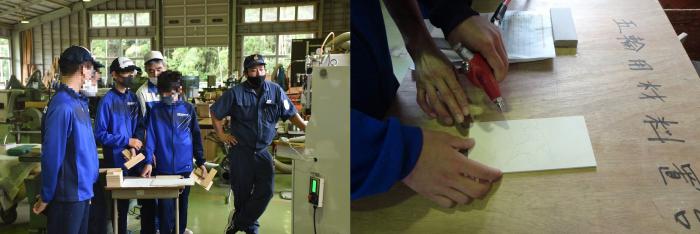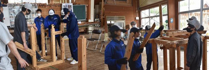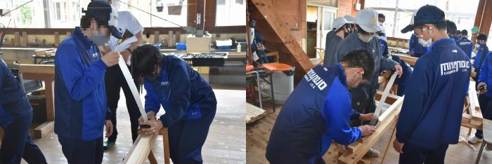 当日は、ものづくりマイスターや職員の指導の下、建築工学科では「木組み模型の棟上げ・鉋薄削り・外壁工事・小型建機運転・測量機器」の体験を、室内造形科では「各種木工機械による木材加工・NC工作機械・スプレーガンによる塗装」の体験をしていただきました。また、各科の2年生が中学生のサポートをしてくれました。