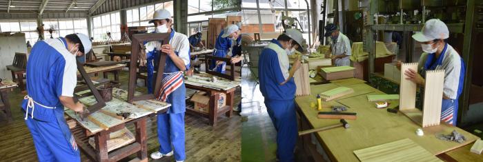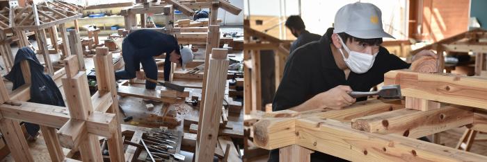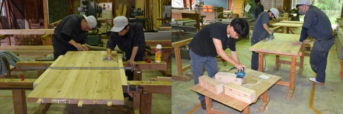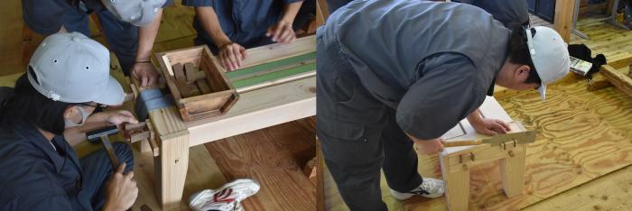暦の上では仲秋となり,朝夕はかすかに秋の気配を感じますが,日中はまだまだ残暑が厳しいようです。訓練生は朝から夕方まで実習に明け暮れています。建築工学科1年生は10種類を超える継手を製作し,腕を磨いています!室内造形科1年生は,高脚花台の塗装下地の調整を学んでいます。各科2年生は製品製作をしながら、コロナ禍の就活戦線に奮闘中です!キバレ就活生!!