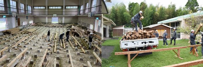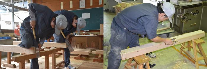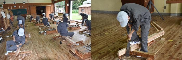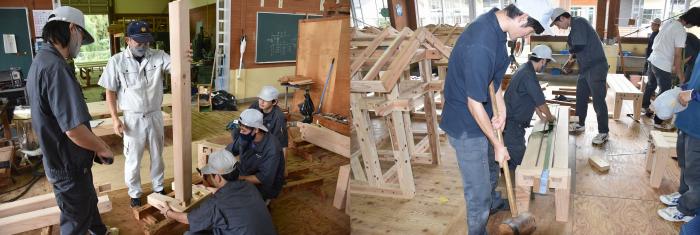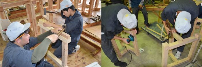 さて,2018年3月に閉校した薩摩川内市の陽成小学校体育館が、野球などの室内練習場に生まれ変わろうとしています。施設を運営・改修する建築事務所から,SDGs推進の一環で,廃材を実習木材として活用してほしいとの申し出がありました。提供された解体材は,体育館の床を40年以上支えてきた栂(ツガ)の木,約4㎥。最近は伐採もわずかなので,お目にかかるのは珍しくなった建築材料。昔からネズミはツガをかじらないと言われるように、木の状態が思いのほか良かったため、建築工学科2年生14名が訓練の一環としてベンチとテーブルを製作し,施設に寄贈することに!技能習得のため,随所に大工技能を盛り込んだ作品は,製作日数10日程度で完成しました。また,解体材には40年前のかすがいや釘が残っており,釘抜き作業に全員で丸2日要するなど,さびた釘に苦労したため,今回は金物や釘を使わず,楔(くさび)や込み栓,雇い実(ざね)など,木組みの技を駆使しました。