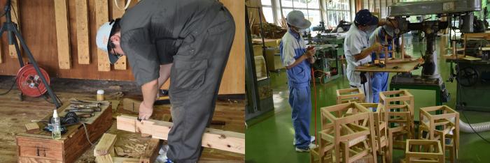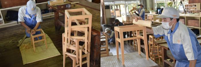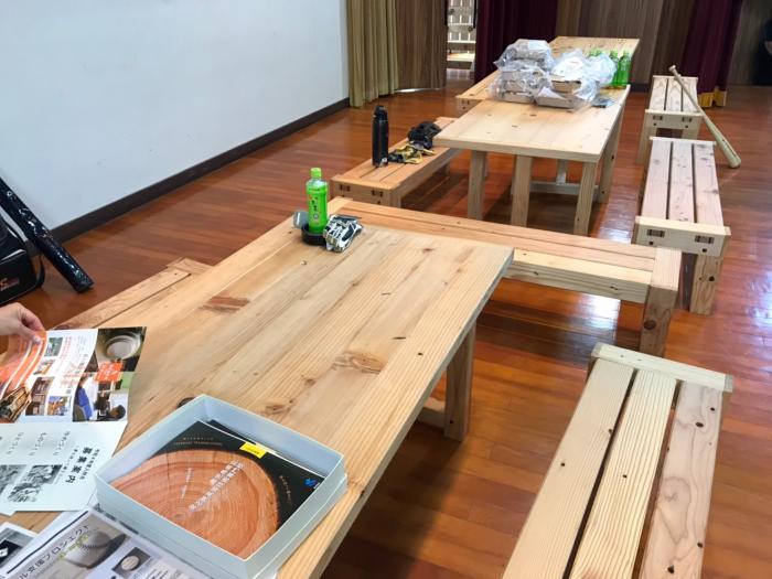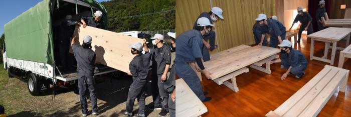 先日,施設オープンを前に,廃材による3人掛けベンチ(製品名:リベンチ)8脚と,廃材を矧(は)ぎ合わせた天板の高さを2段階に調整できる6人用テーブル(製品名:ハイ&ローテーブル)3台を引き渡しました。思いがけない寄贈に大変喜んでいただき,訓練生も誇らしげでした!