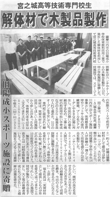 閉校した陽成小学校体育館活用工事の廃材で製作した木製品を,同施設に寄贈した取り組みが業界紙に掲載されました。