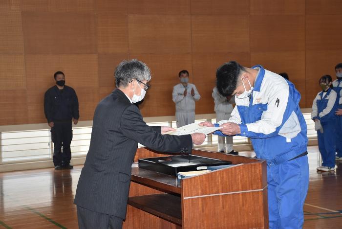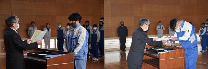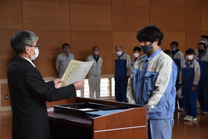 さて,先般開催された校内技能競技大会の表彰式が,第二過程終業式に合わせて執り行われました。県職業能力開発協会から表彰された上位入賞者に,東校長から賞状や盾が手渡されました。審査結果は以下のとおりです。入賞した皆さん,おめでとうございます!