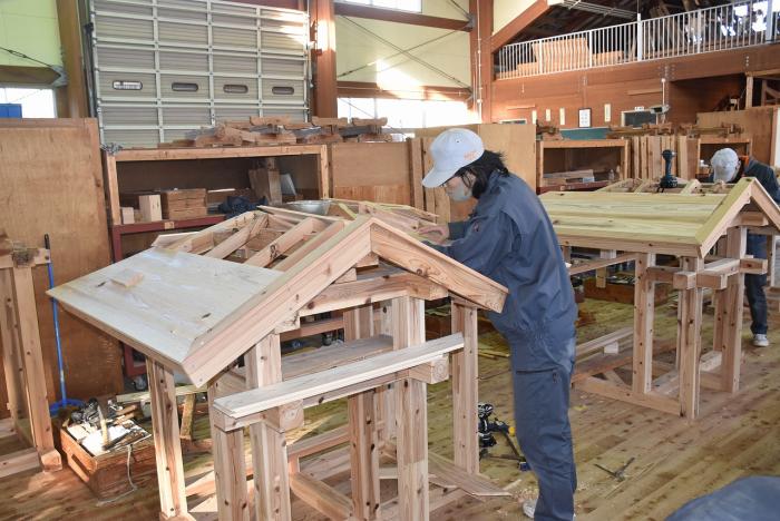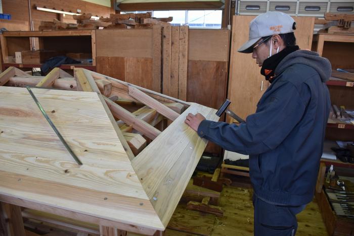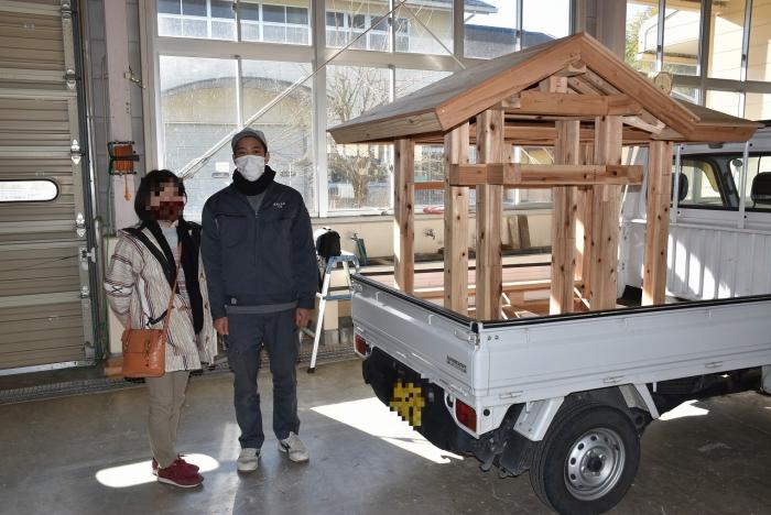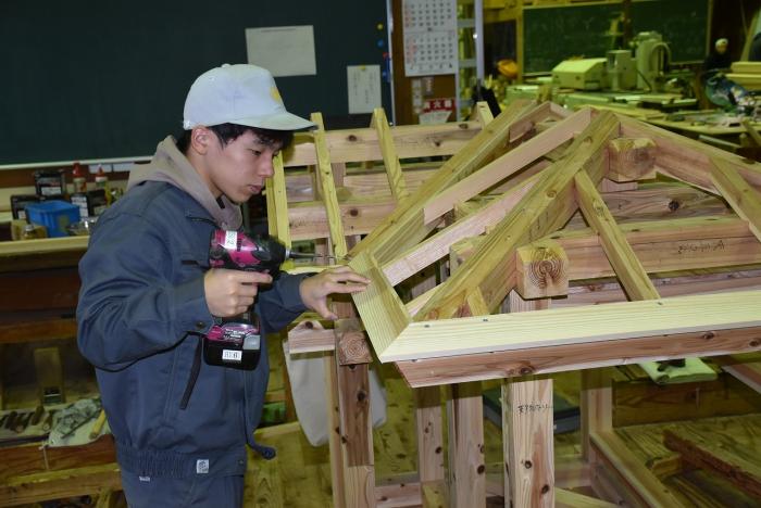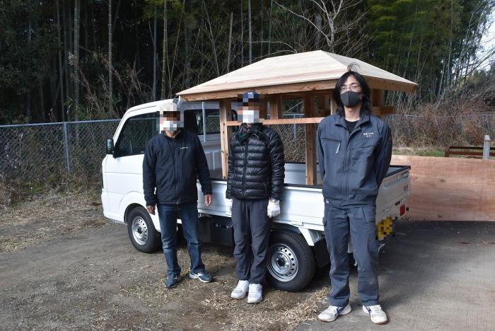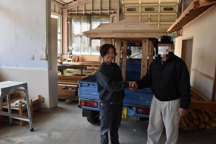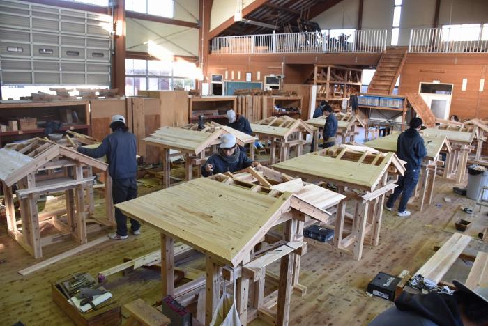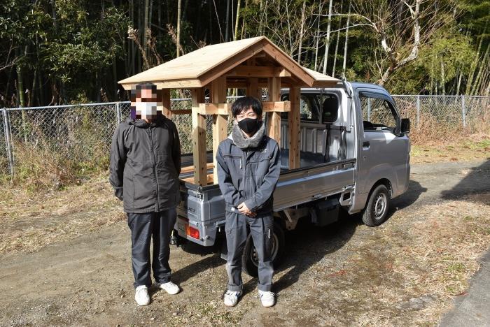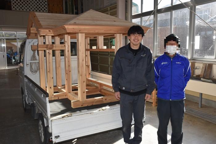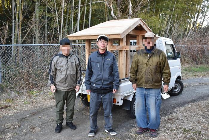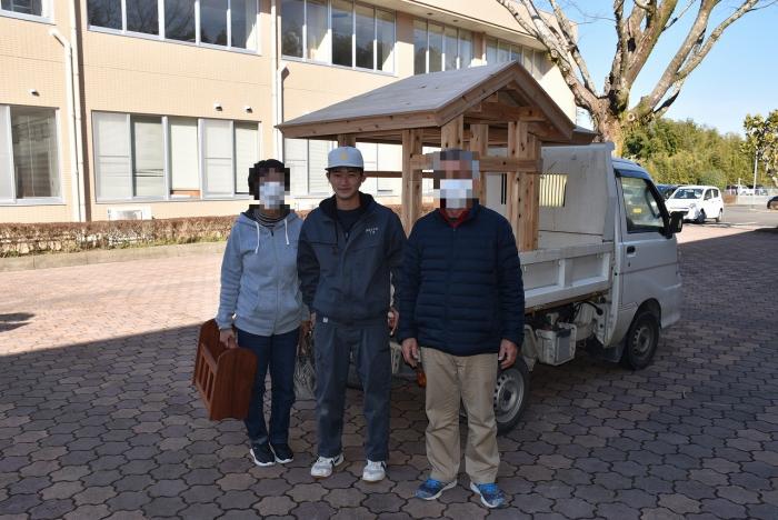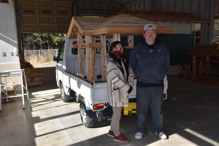 建築工学科の訓練生は、古来より伝わる継手・仕口を修得するために、金物を使用しない木組みの技で小屋を製作します。修了を前に、無事に全員が屋根仕舞いまで終えました。持ち帰れない訓練生に代わり、地域の方々9名が譲り受けることになり、先日引き渡しとなりました。毎年訓練生が1人1棟製作しているこの小屋は、これまでに馬頭観音様の祠(ほこら)や北薩広域公園の水車、保育園の遊具や園芸用ハウスさらに大型犬の小屋など、あらゆる方面で利用されています。製作した訓練生も地域のお役に立てて嬉しそうでした!