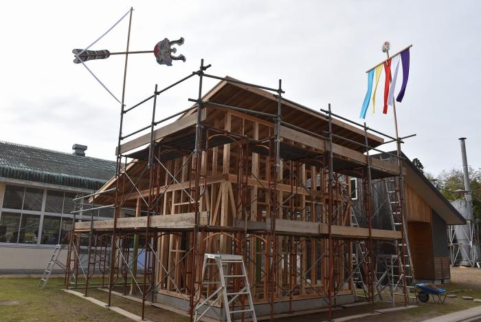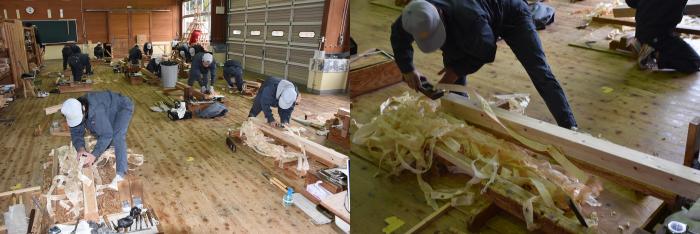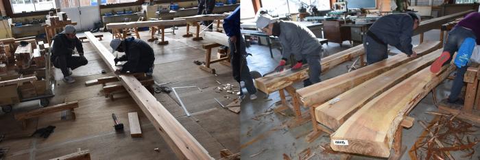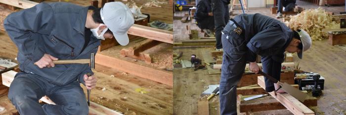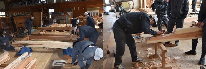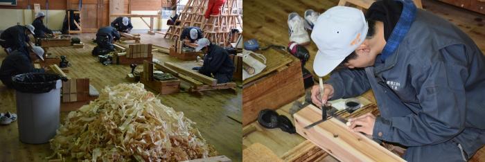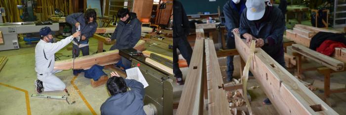 新型コロナの訓練への影響はさまざまなところで起きています。昨今の木材価格の急騰「ウッドショック」の背景には、コロナ禍に影響された需給バランスの崩壊という側面があります。欧州・北米産地での労働力不足による供給停滞や流通停滞。また、中国での需要増に加え、米国での巣ごもり需要や災害による住宅需要の急増など、国際的な需給バランスの急変により供給量が逼迫し、世界的に木材の価格が上昇しています。この輸入材の価格上昇のあおりを受け、2021年から国産杉も高騰。一立米あたりの販売価格が、一昨年からすると倍近くになっています。そのような状況の中で挑んだ修了製作。先日、無事に上棟を迎えましたが、予算の都合で、今年度は躯体工事で打ち止めとなりました。残りの仕上げ工事は、後輩たちが担います。