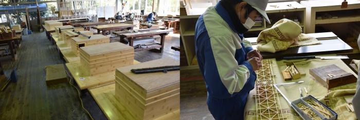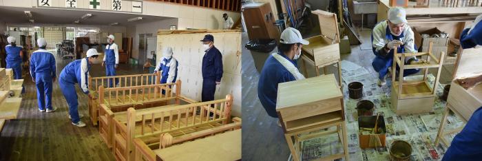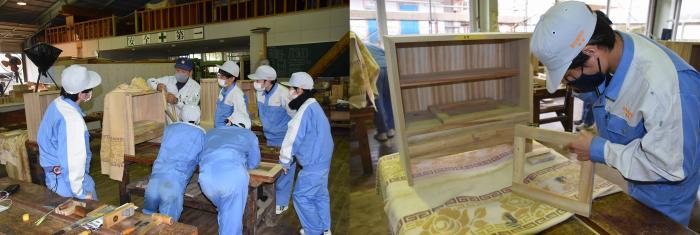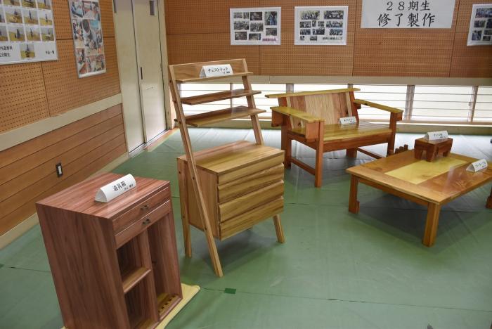 修了を間近に控えた室内造形科2年生の製品製作も佳境を迎えています。これらの作品は、応用実習として設計・加工・組立・塗装までを一貫して作業させ製作したもので、在校中の記念作品としての意味合いもあります。2年間学んだ知識と技能を駆使して製作した家具は修了式(3月15日)の式場に展示され、式典に華を添えます。