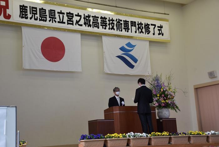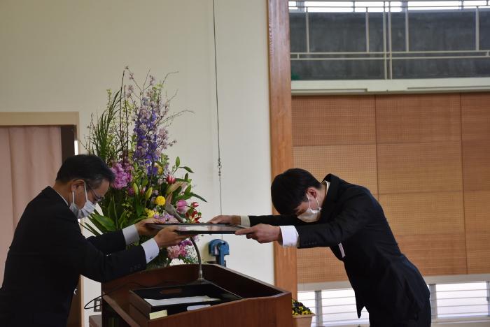 3月15日、修了式が執り行われました。新型コロナウイルス感染症拡大防止の観点から、昨年同様、規模を縮小し、在校生や一部来賓者のご参列をご遠慮いただき、保護者は訓練生1人に対し2人までと制限させていただきました。