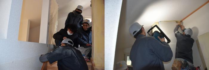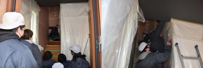 訓練生は、階段造作はもちろん、パテ処理やクロス貼りを経験し、壁下地やボード張りの工程がいかに大切かを学んだようです。クロス貼り初心者には難易度の高い内容でしたが、外部講師の先生には当時の事情を汲んでいただき、モデルハウスの完成にご尽力いただきました。年度末のお忙しい中、引き受けていただきありがとうございました。