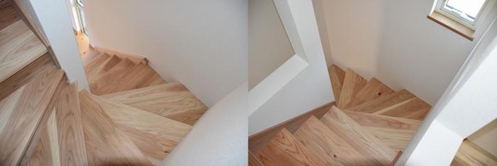 建築工学科16期生に課した最後の課題。それは、2年前に建てたモデルハウスの廻り階段設置と階段ホールのクロス貼り。当時、完成が目前に迫った3月、コロナ禍による臨時休校のため、予定していた階段設置と内装実習が中止となり、14期生は失意のままに修了を迎えました。この度、2年越しに立派な廻り階段が取り付けられ、階段ホールが仕上がりました。予算と時間の都合で、廻り階段部分の側桁は省略しましたが、先輩たちの思いを託された後輩たちが、8日間という限られた時間内で仕上げてくれました。
