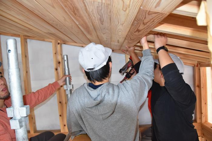 昨年度の修了製作は、ウッドショック(木材価格高騰)のあおりを受け、躯体工事で打ち止めとなりました。先輩たちの思いを託された17期生が、今年度の修了製作として内外装工事を引き継ぎ、先日無事にその一部が完成しました。この度、修了を記念して「オープンハウス(構造見学会)」を開催し、修了式当日にお披露目します!こうご期待!!