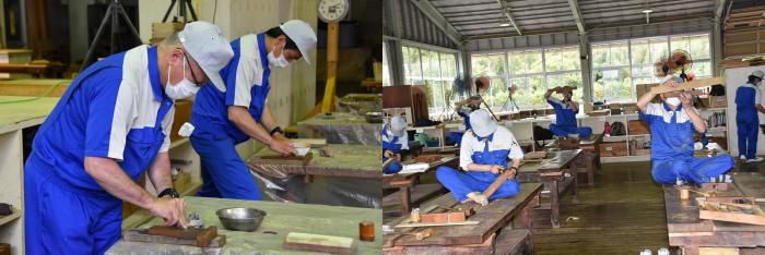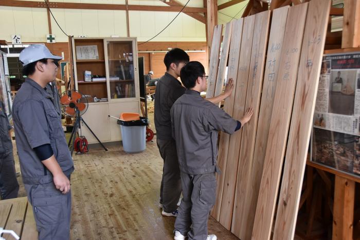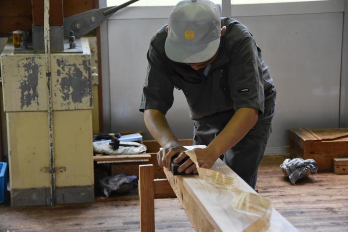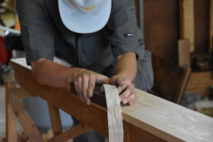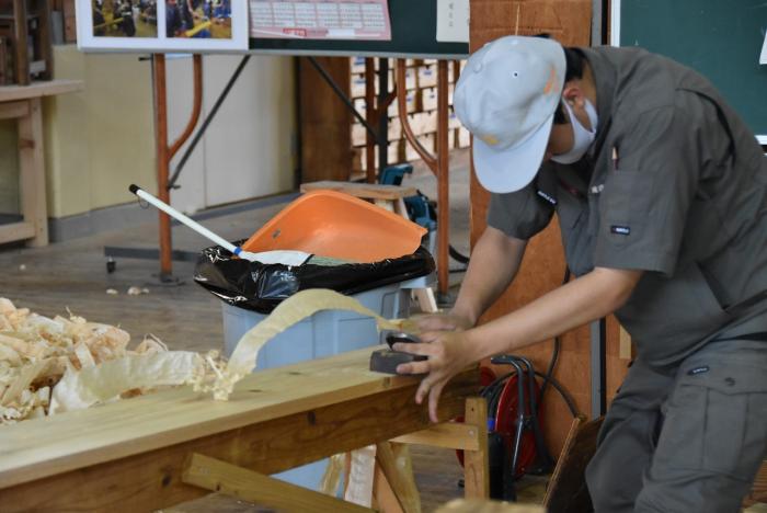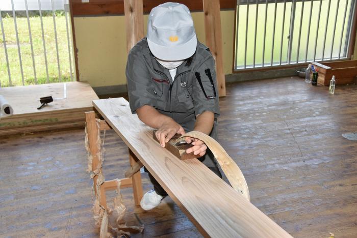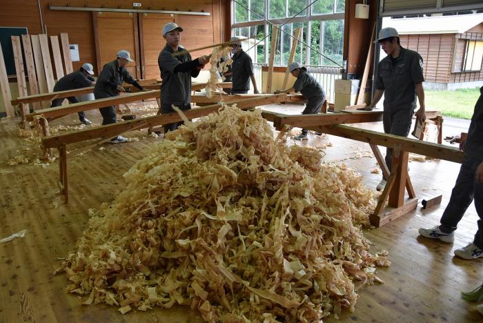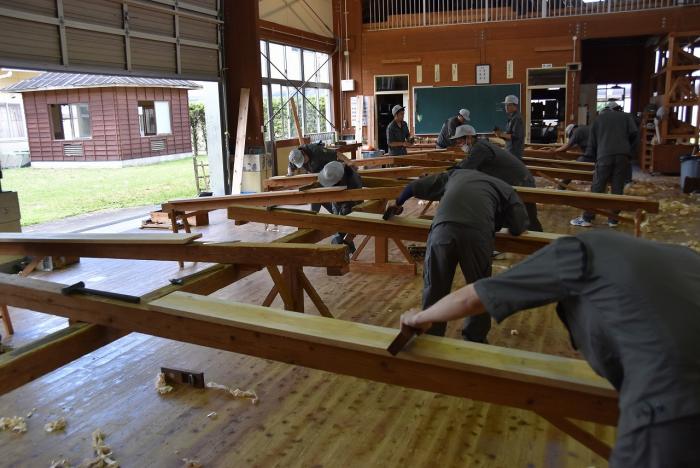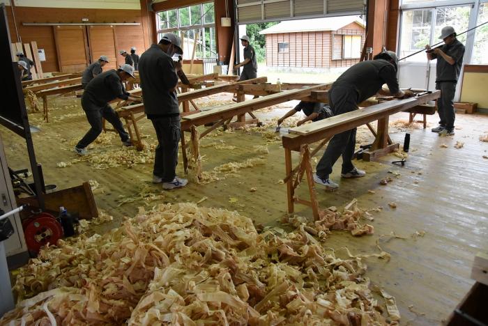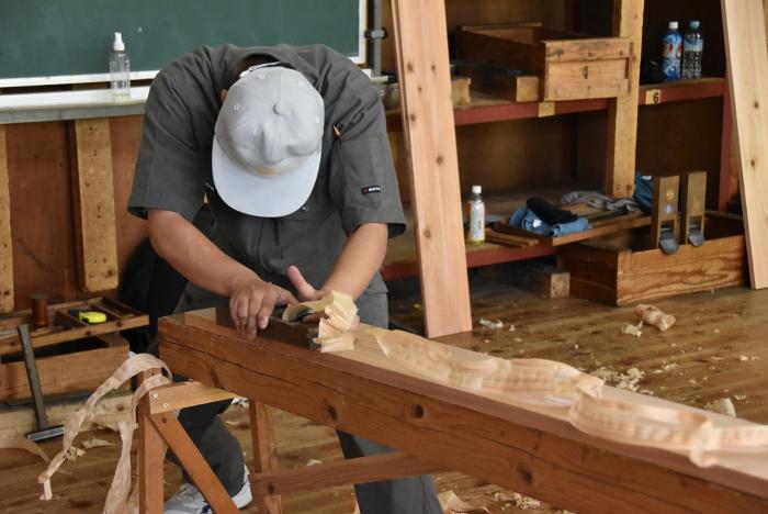梅雨入りを前に、建築工学科1年生13名が恒例の板削り試験に挑みました。8分(24mm)の荒板を規定寸法に仕上げ、寸法精度や削り肌の仕上がりを競います。鉋(かんな)は大工道具の中でも極めて奥が深く、刃研ぎや仕込み、鉋台の調整にかなりの熟練を要する道具です。入校して2カ月、刃物研ぎや鉋の調整に明け暮れてきました。当日は、訓練の成果を発揮するため、体力の限界に挑むかのように2時間以上削り続ける耐久レースの様相を呈していました。試験後は、先輩達による厳しい品評会が行われました。