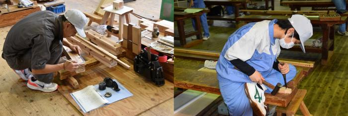 五月病もなんのその!訓練生は午前中に座学、午後からは実習に励んでいます。建築工学科2年生は、木組みの小屋製作と並行して、昨年度購入した「くさび緊結式足場」を設置しました。室内造形科2年生は製品製作に奮闘しています。1年生は初めて扱う工具の使用法や刃物研ぎに四苦八苦!