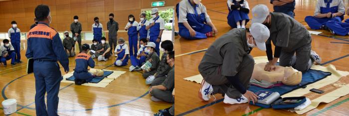 また、先日は1年生を対象にAED講習を実施しました。梅雨入り前の爽やかな陽気に、訓練生もエンジン全開です!!
