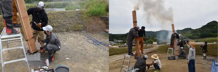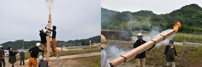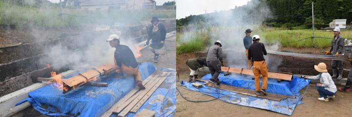 5月某日、焼杉体験のお誘いを受け、建築工学科2年生の有志7名が参加!炎で暖められた空気が温度差によって強い上昇気流を生み出すドラフト現象を利用した先人の知恵に感心させられました。焼杉材は、厚い炭化層があり耐久性も高く、メンテナンスフリーなコスパの良い外壁材。自然素材の焼杉の「黒」には、味わい深い風合いがあり、炭化層がはがれる経年美化も意匠性の魅力。午前中だけの参加となりましたが、先輩方の指導の下、99枚を焼き終えました。焼杉のあとは訓練生のたっての希望で肉を焼くことに…(笑)。訓練生にとっても、貴重で有意義な体験となりました。ご協力いただいた関係者の皆様、ありがとうございました。
