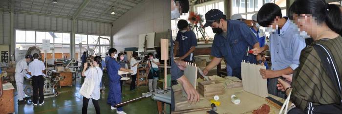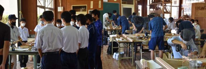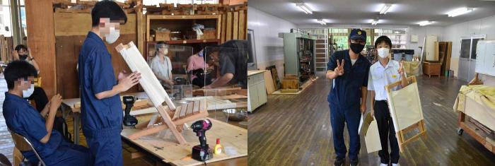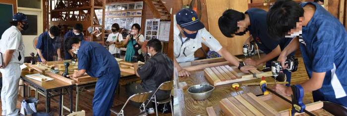 若者にものづくりの魅力を感じてもらうため、室内造形科では木工機械を実際に操作し、材料の加工から組立、塗装まで、家具製作の一連の流れを体験し、「マガジンラック」を製作していただきました。建築工学科ではプロ仕様の電動工具や治具を使い「県産材を活用した休息いす」を製作していただきました。熱中症に注意を呼びかけながらの体験となりましたが、参加された皆さんは、暑さや時間を忘れて、ものづくりに没頭していました。わずか3時間で2作品を完成させた参加者の表情は達成感に満ち溢れ、満足げに作品を持ち帰る姿が印象的でした。