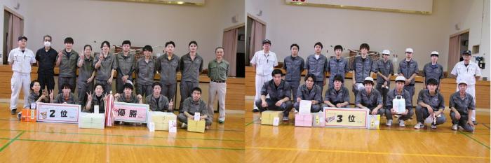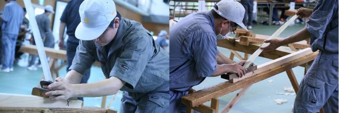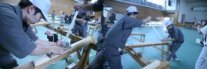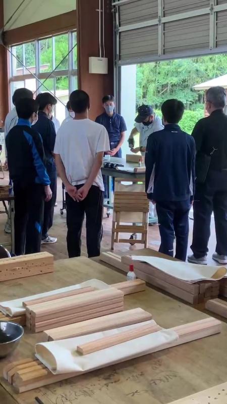 当日は気温も高く、競技会場は熱気に包まれ、熱中症対策を講じながらの競技となりました。競技は午前中に団体戦の予選、午後から団体戦決勝と個人戦が行われました。削る材料は予算と技量の都合で、「削ろう会」公式ルールの半分の長さとし、地元のヒノキ材を使用しました。団体戦は、全科から8チーム(54名)がエントリーし、制限時間内のチームの平均記録で競いました。また、団体予選はルール改正した昨年同様、各学年の予選総合1位と2位のチームが決勝に進出することに。これにより1年生も決勝戦に上がれるチャンスが生まれる一方、2年生は予選で潰しあうとういう過酷なものに…。