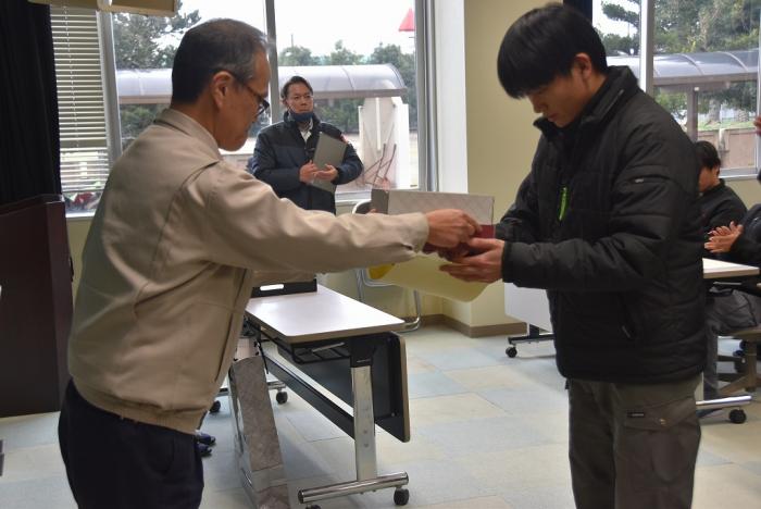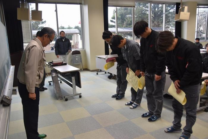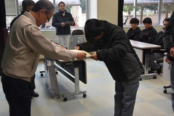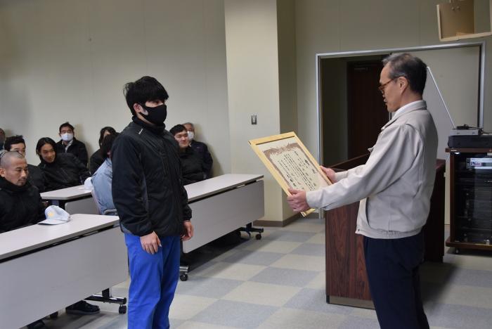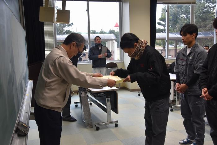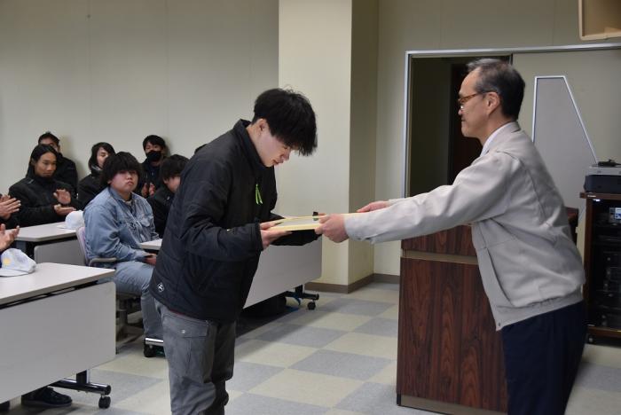 先般開催された第61回技能五輪全国大会及び校内技能競技大会の表彰式が、第三過程終業式に合わせて執り行われました。厚生労働大臣及び県職業能力開発協会会長から表彰された上位入賞者に、永田校長から賞状やメダル、トロフィーが授与されました。競技結果は以下のとおりです。