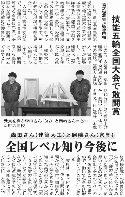 次世代のものづくりを担う青年技能者が技の日本一を競い合う「第61回技能五輪全国大会」の家具職種に出場した岡﨑龍生選手(室内造形科2年)と、建築大工職種に出場した森田洋介選手(建築工学科2年)が敢闘賞を受賞しました!九州勢の入賞は、家具職種で6年振り、建築大工職種では10年振りの快挙!!
