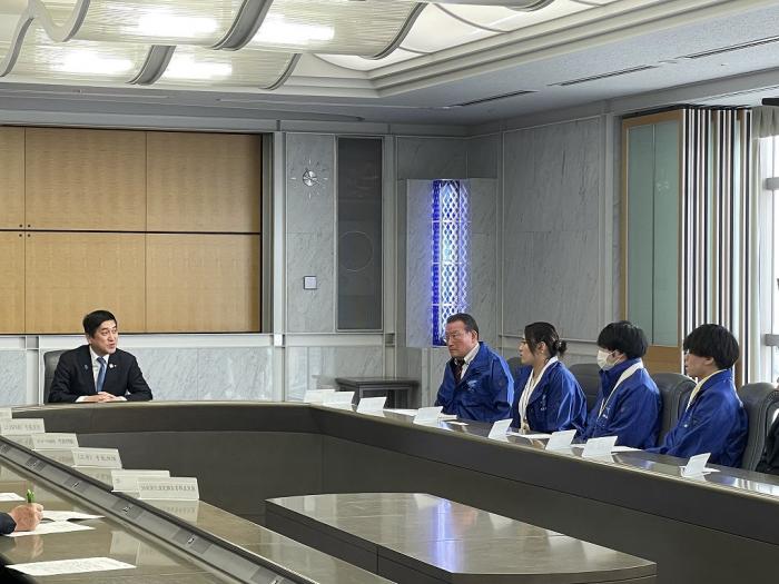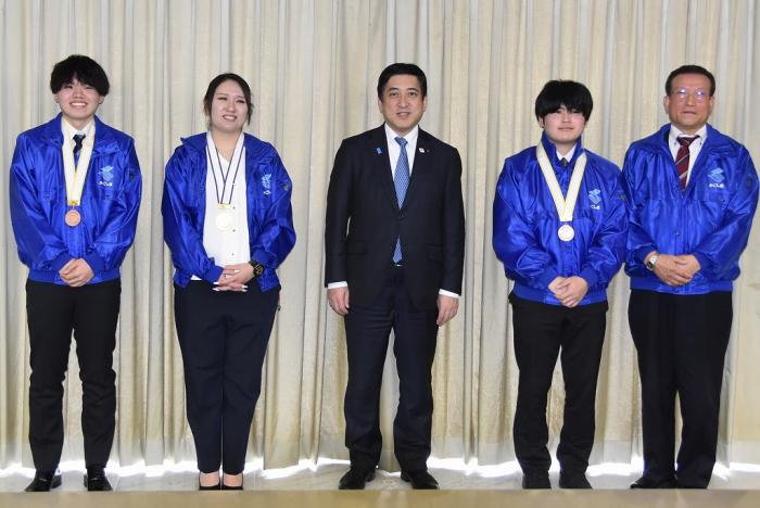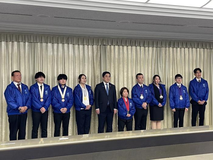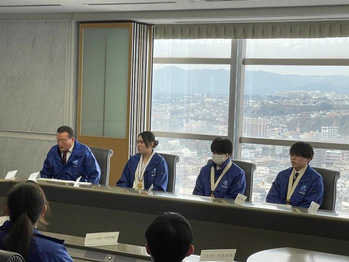 ものづくりなどの技を競う全国大会で入賞した県代表選手らが塩田知事を表敬訪問しました。訪問したのは,技能五輪全国大会と全国障害者技能競技大会(アビリンピック)で入賞を果たした県代表7人です。