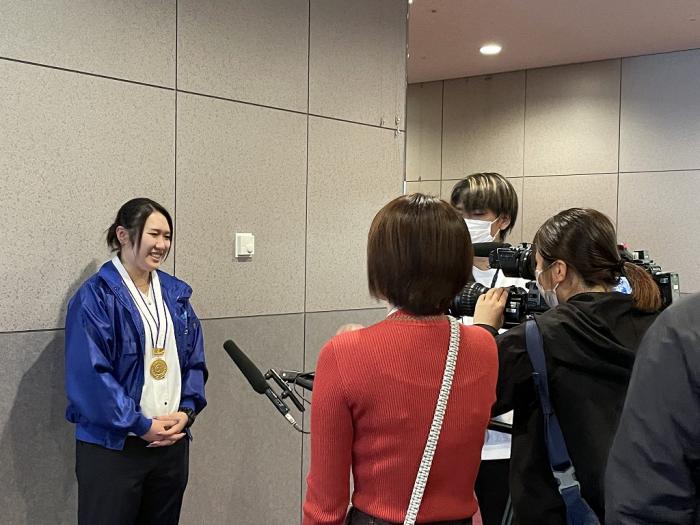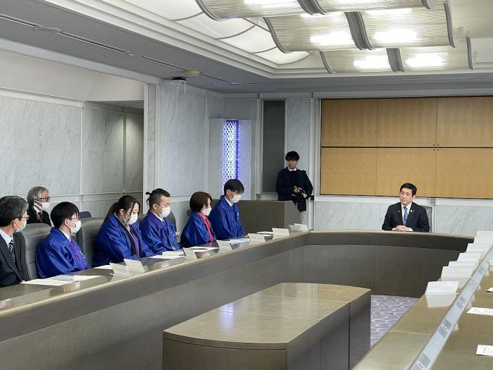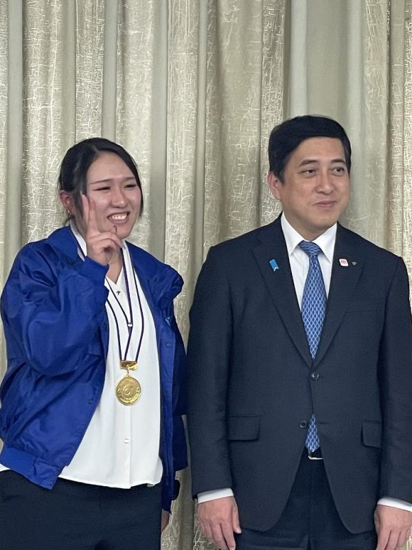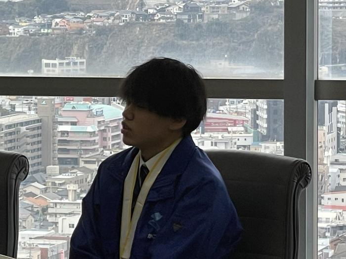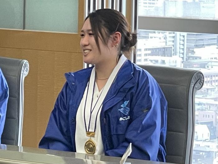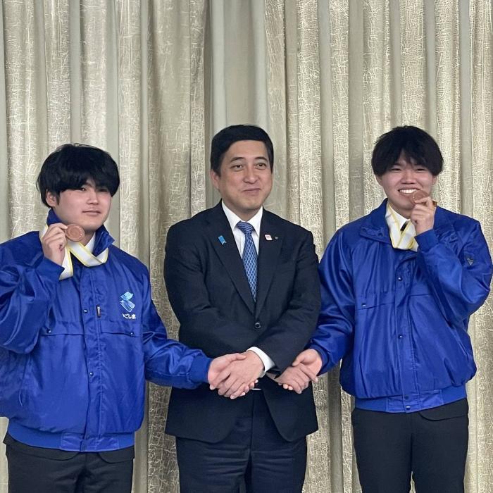 本校関係者は,家具職種と建築大工職種でそれぞれ敢闘賞を受賞した訓練生2名(岡﨑龍生,森田洋介),建具職種に出場し,県内で21年ぶりに金賞を受賞した修了生(福留紫音さん)です。選手らは当時の練習方法などを塩田知事に話しました。お忙しい中,ご対応いただきありがとうございました!