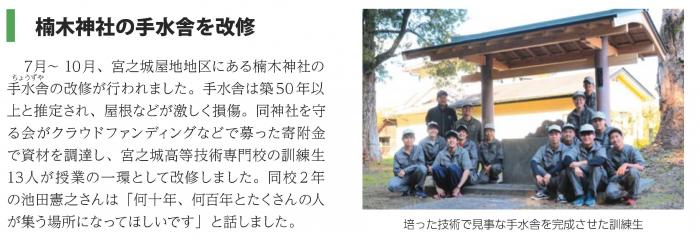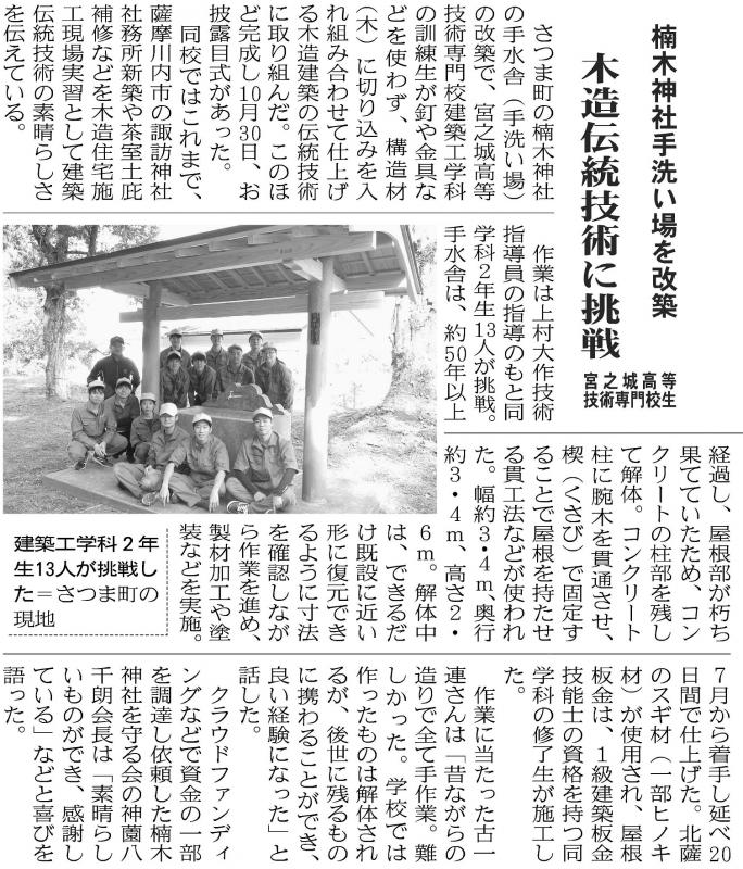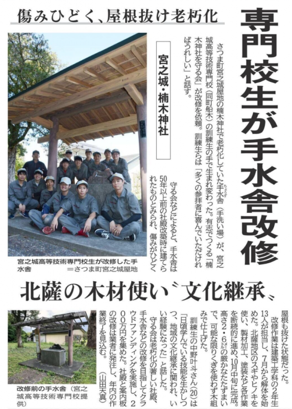 ホーム > 産業・労働 > 雇用・労働 > 職業能力開発 > 宮之城高等技術専門校 > 各科紹介 > 建築工学科 > 建築工学科の現場実習 > 楠木神社手水舎改築工事【R5年度】