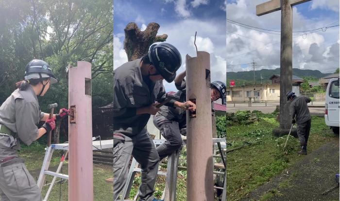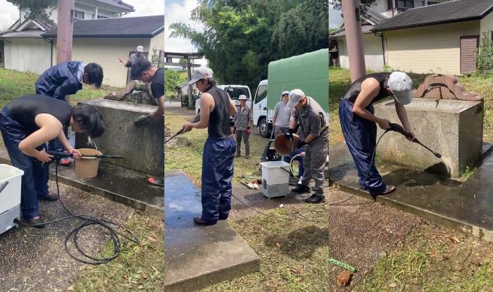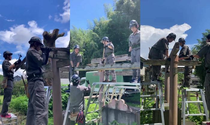 この度、境内の老朽化した「手水舎」を建築工学科2年生が改築することになりました。先日、六月燈を前に解体工事を無事に終えました。電気・水道が停止中の現場のため、発電機やローリータンクを使用しながらの解体作業となりましたが、連日の猛暑の中で訓練生は一生懸命取り組んでいました!
