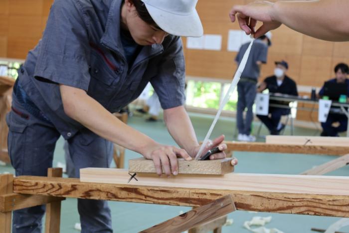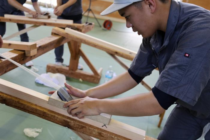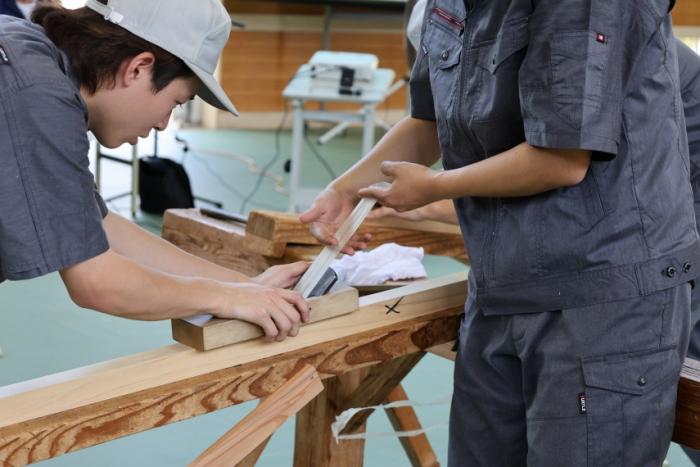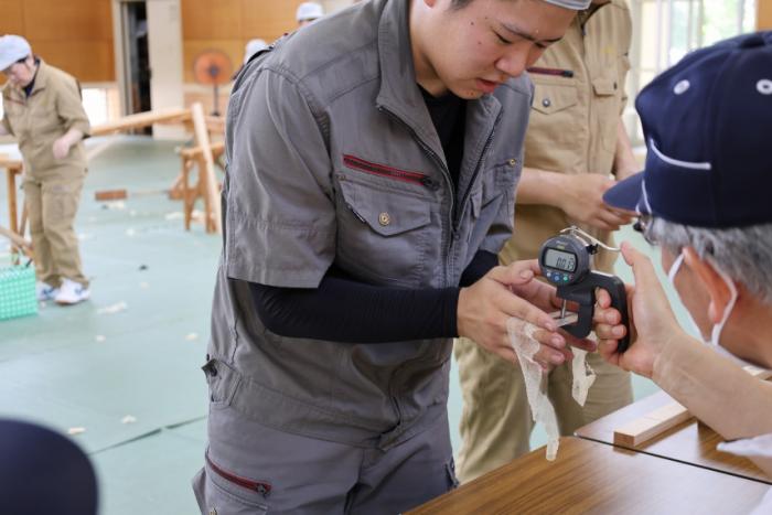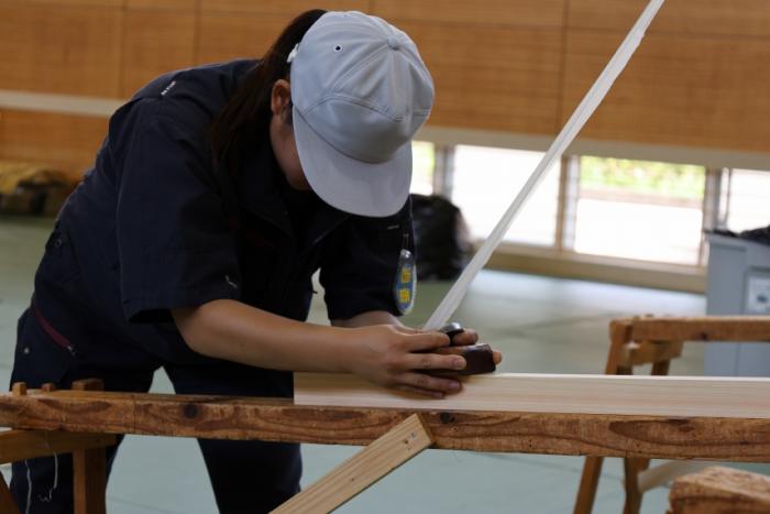 当日は、午前中に団体戦の予選、午後から団体戦決勝と個人戦が行われました。削る材料は予算と技量の都合で、「削ろう会」公式ルールの半分の長さとし、地元のヒノキ材を使用しました。団体戦は、全科から10チーム(39名)がエントリーし、制限時間内のチームの平均記録で競いました。団体予選を勝ち抜いた4チームによる決勝戦では,先輩が経験の差を見せつけ、室内造形科2年生Aチームが優勝。午後から行われた個人戦では日頃の訓練の成果を発揮しようと各自が薄さの限界に挑み、会場全体が熱気に包まれました。記録や順位が目まぐるしく入れ替わる中,建築工学科2年生がミクロン対決を制しました。初めての大会となった1年生も,団体決勝や個人戦上位に名を連ねるなど大いに健闘しました。来年はさらにハイレベルな戦いを期待しています。