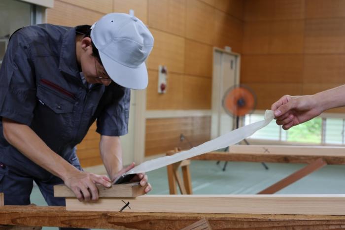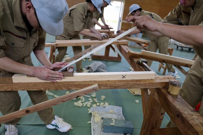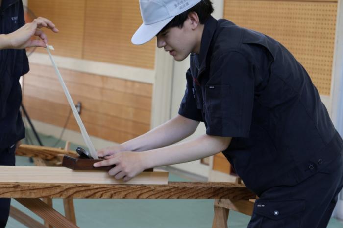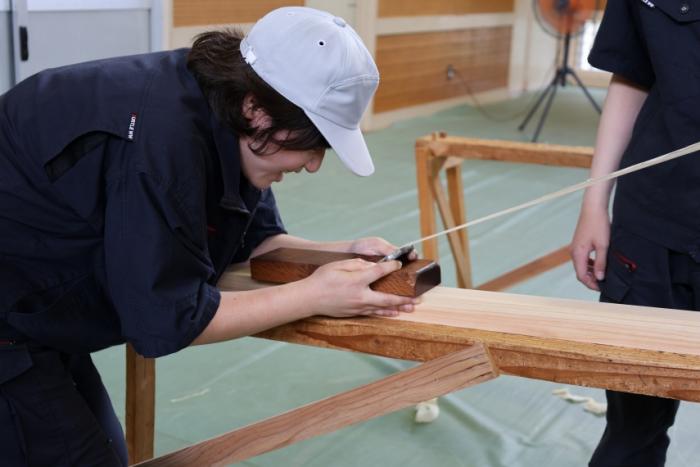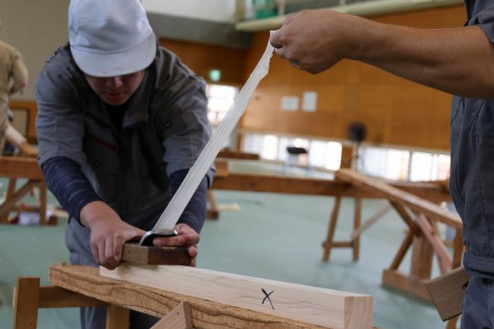 6月27日(金曜日)に恒例の開校記念行事「鉋(かんな)薄削り大会」を開催しました。この日に向けて連日特訓してきた訓練生は、ヒノキ材の表面を極限まで薄く削るミクロン単位の熱き戦いを繰り広げました。