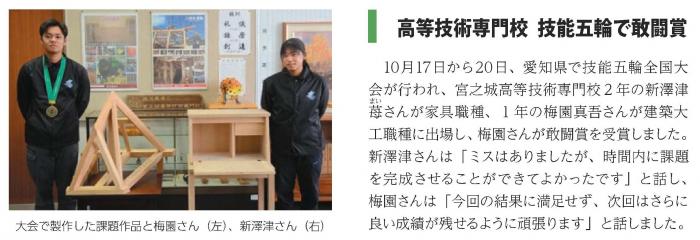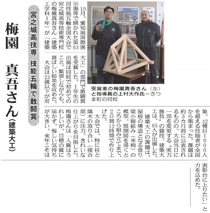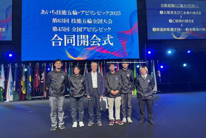 次世代のものづくりを担う青年技能者が技の日本一を競い合う「第63回技能五輪全国大会」で鹿児島県代表選手が健闘!建築大工職種に出場した建築工学科1年生の梅園真吾さんが,当科として2年ぶり3回目となる敢闘賞を受賞しました。1年生の同大会への出場は本校初であり,同職種での11位は本県で最高位の成績。また,今大会に出場した九州勢の中でも最高位の成績でした。家具職種には,室内造形科2年生の新澤津苺さん,当科修了生の有薗誠さん,平蓮翔さんが出場。建具職種には当科修了生の溝口京吾さんが出場しました。