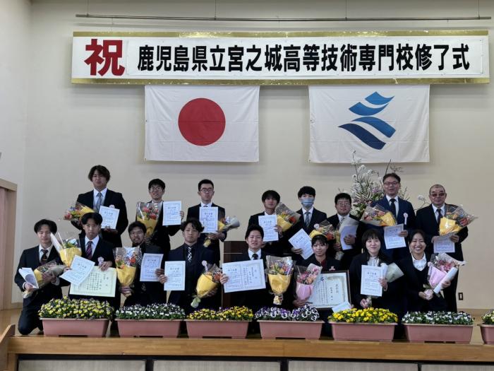 式では、知事賞や校長賞、優秀技能賞などの表彰が行われました。福迫校長の式辞では、「この2年間、積み上げてきたもの、培ってきたものに自信と誇りを持って、それぞれが目指す道を歩んでください。前向きに、真摯に、努力と研鑽を積み重ね、立派な社会人として、大きく成長されることを、心から期待しております。私ども、宮之城高等技術専門校の職員は、これからも、夢に向かって邁進する皆さんを応援いたします。」と激励の言葉がありました。