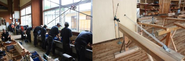 6月某日の訓練の様子です。午前中の学科の授業では、1年生が大工必須の「規矩術」を学んでいました。午後からの実習では、2年生が和風小屋組の製作を行っていました。