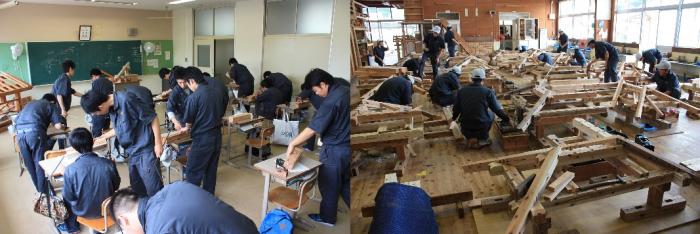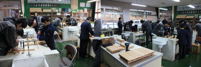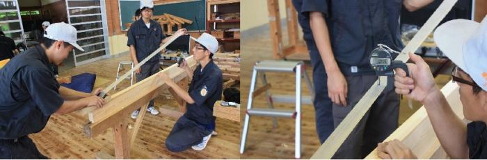 11月某日、毎年恒例の校内技能競技大会が開催されました。建築工学科1年生は「継ぎ手・仕口工作」、2年生は「登りばり架け」の課題を製作しました。かんなでの木削り、墨付け、加工、組立ての順に作業を行い、制限時間内の出来映えや精度で競います。技能向上意欲を一層高めるため、成績優秀者は県職業能力開発協会長から表彰されます。