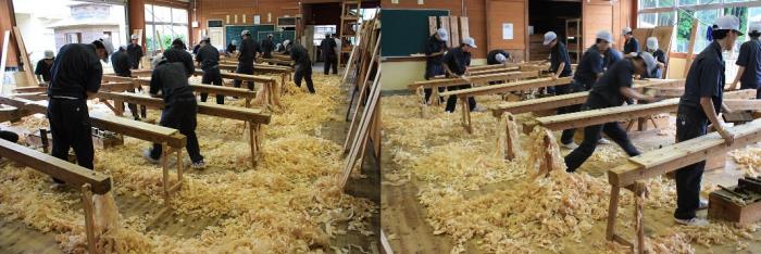 また、この日は1年生にとって毎年恒例となっている板削り試験でした。荒仕工鉋、中仕工鉋、仕上げ鉋を使い分け、8分の荒板を6分板に仕上げます。寸法精度や削り肌の仕上がり、競技時間を競う試験です。