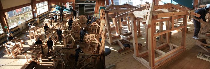 2年生は北薩広域公園新築工事と並行して進めていた個人の基礎小屋模型が、第2過程終業を前に上棟を迎えました。古来より伝わる継手、仕口を用い、金物を使用しない木組みの技で組み上げた基礎小屋は訓練生の成長の証です。年明けに屋根工事や内部造作をして、一応の完成をみます。