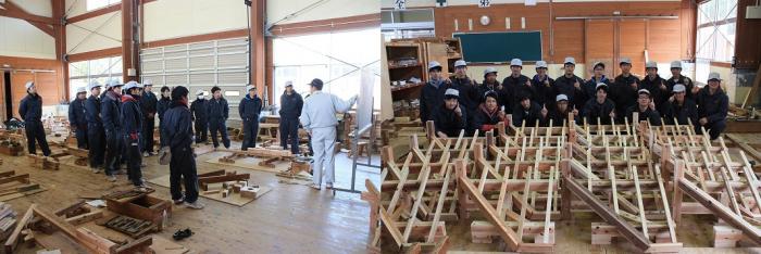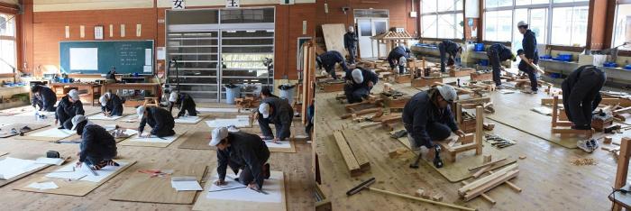 今年度最後の訓練の様子です。県予選を終えた1年生は「谷隅木模型」を制作しました。この1年間で手工具の扱いにも慣れ、たくましく成長しました。4月から後輩の良き手本となってくれることでしょう。