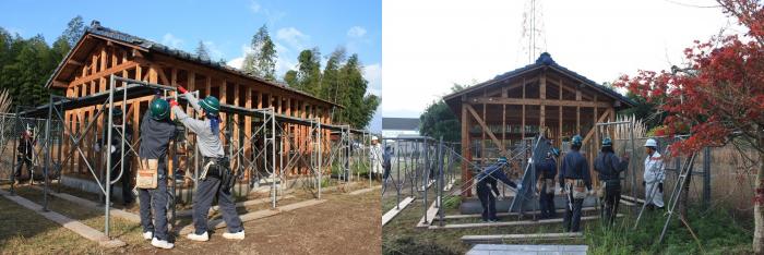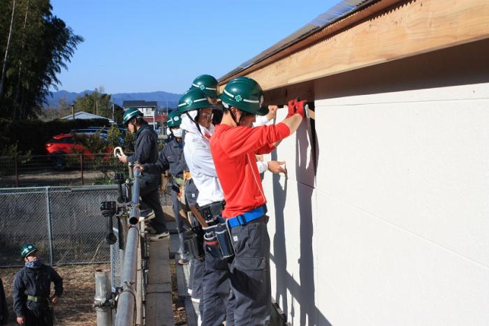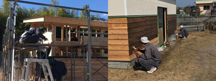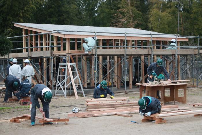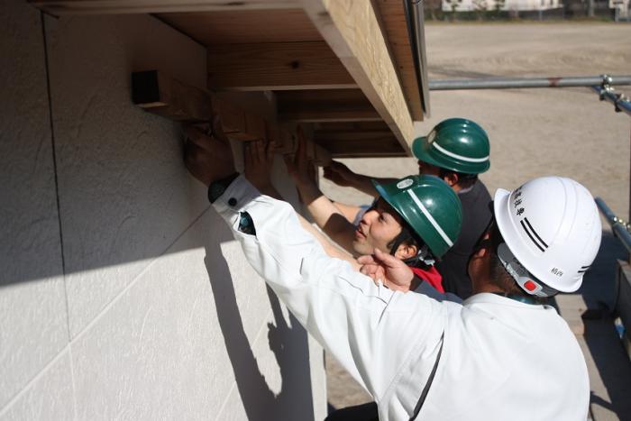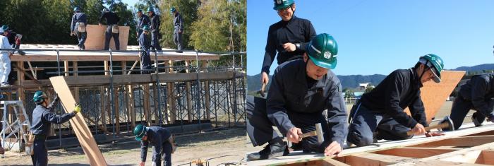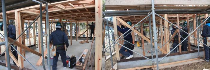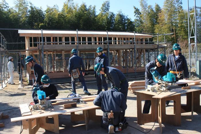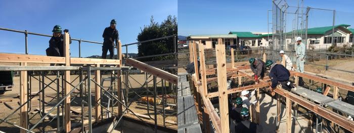 第3過程もいよいよ残り1ヶ月余りとなりました。建築工学科2年生と建築科が合同で行っている体育倉庫の建て替えは、構造材の加工を終え、建て方、屋根仕舞いを行いました。修了試験も間近に控える中、完成に向けてラストスパートです。