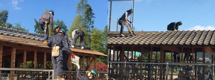 CAD演習を終えた2年生は、昨年の台風15号で被害を受けた体育倉庫の建て替えに着手。手始めに、解体工事で瓦や野地板、板壁を取り外しました。20年前の訓練生が実習で建てた倉庫は老朽化が進んでいるため、基礎部分だけ残して全面建て替えます。工事の進捗状況を随時お伝えしていきます。!