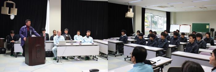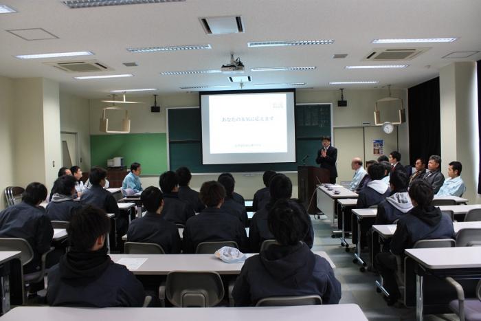 2月某日、建築工学科1年生を対象に、県内最大の棟数実績を誇る住宅メーカーの企業説明会が行われました。創業以来、地元の木材を活用した住まいづくりを通じて、「鹿児島の気候風土にあった住まい」とはどうあるべきかを常に問い続け、家族みんなが健康で安心して暮らせる「住まい」の実現に取り組んでいる会社です。今年で創業69年を迎えるそうで、偶然にも本校が開校した1948年創業です。