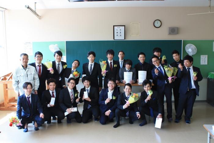 多くの方々に支えられ、無事修了の日を迎えました。修了生たちは緊張した面持ちで式に臨み、長友校長から修了証書を授与されました。また、知事賞を受賞した建築工学科の下陳君が修了生謝辞を述べました。式典後、2年間を一緒に過ごした先生方や仲間たちとの別れを惜しみながら、最後のホームルームを行いました。
