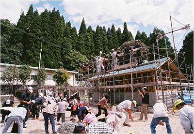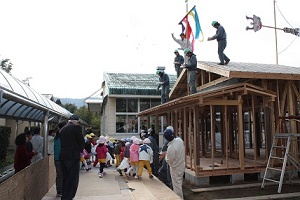 上棟式体験 にぎわい回廊トイレ新築工事の過程で、永野小学校5、6年生と地域住民を招いて上棟式を行いました。 |