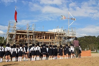上棟式体験 茶室(建工庵)を備えた数寄屋風家屋を製作する過程で宮之城聖母幼稚園生に上棟式を体験してもらいました。 |