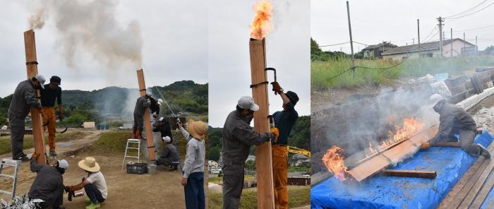 煙突効果を利用した伝統的な「三角焼き」による焼杉材の製作を体験しました。 |