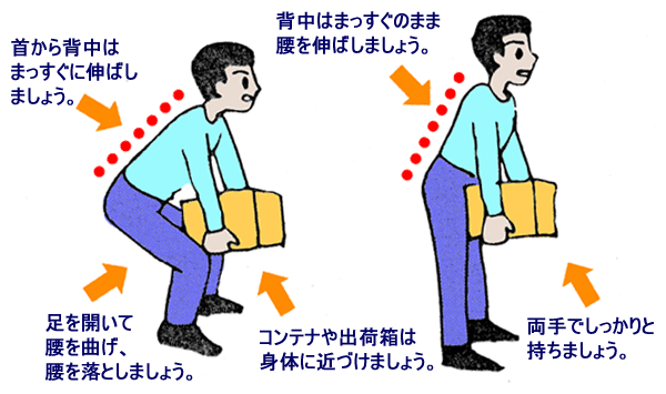 - 重い物の持ち上げ方は,荷物を体の正面近くに寄せて膝を使ってゆっくりと上げ下げする。