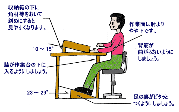 - 作業者の身体にあった作業台とイスの高さを設定する。