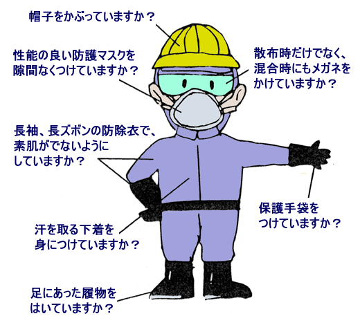 - 農薬散布時は十分な服装装備を行う。