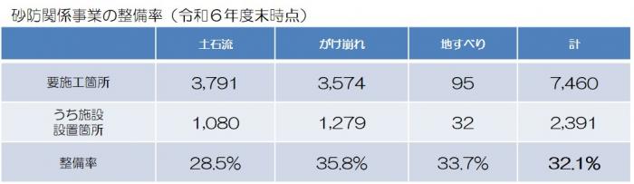土砂災害警戒区域のうち,整備を要する箇所(人家5戸以上等を保全する箇所)は7,460箇所あり,砂防関係事業の整備率は,令和6年度末で約32%と低い状況にあります。