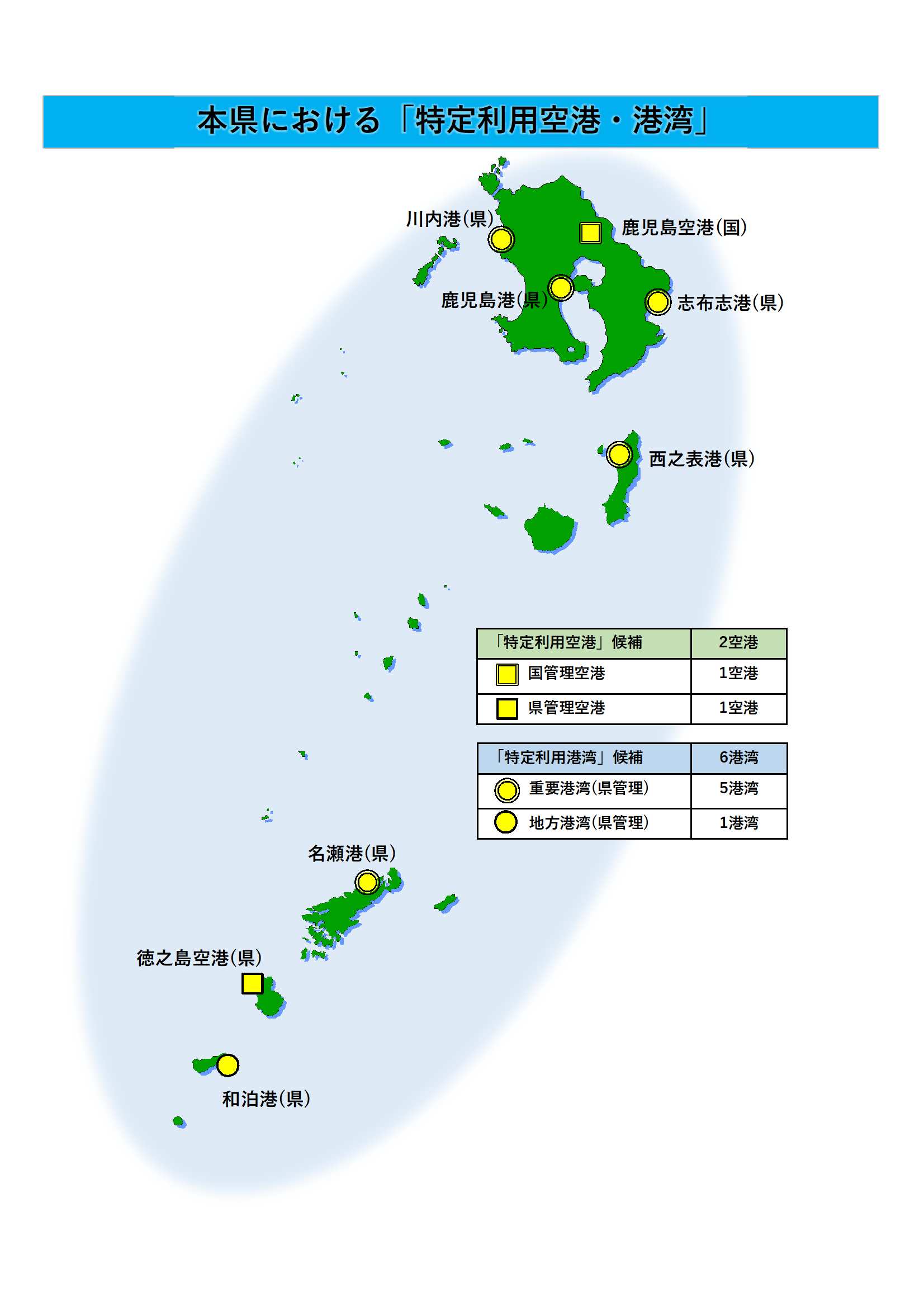 県においては,鹿児島空港(国管理)・徳之島空港の2空港,鹿児島港・川内港・志布志港・西之表港・名瀬港・和泊港の6港湾が「特定利用空港・港湾」の候補とされました。