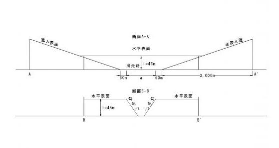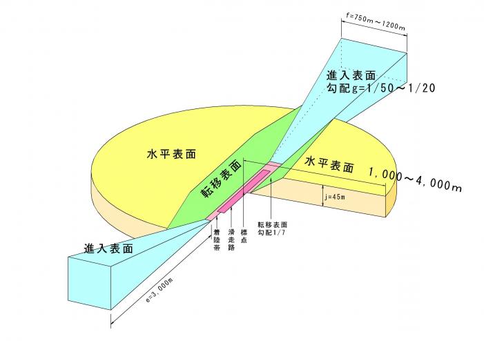滑走路の延長上に設定される空間で長さは3,000メートルで,各空港により勾配,端部延長が異なります。航空機の離陸直後又は最終着陸の際の運航の安全を確保するための表面となります。 |