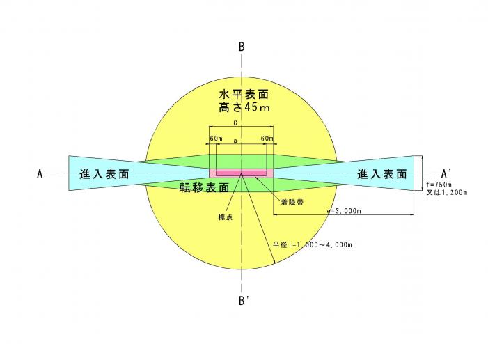 | 水平表面 | 航空機の安全な離着陸経路を確保するために標点(滑走路の中心)を中心に円形で設定される空間で,空港毎に水平表面半径,高さが異なります。 |