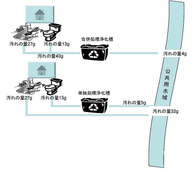 | 単独処理浄化槽 | トイレの汚れだけをきれいにして,台所,洗面所,風呂からの汚れは処理せずそのまま放流。(H13年度以降新設禁止) |